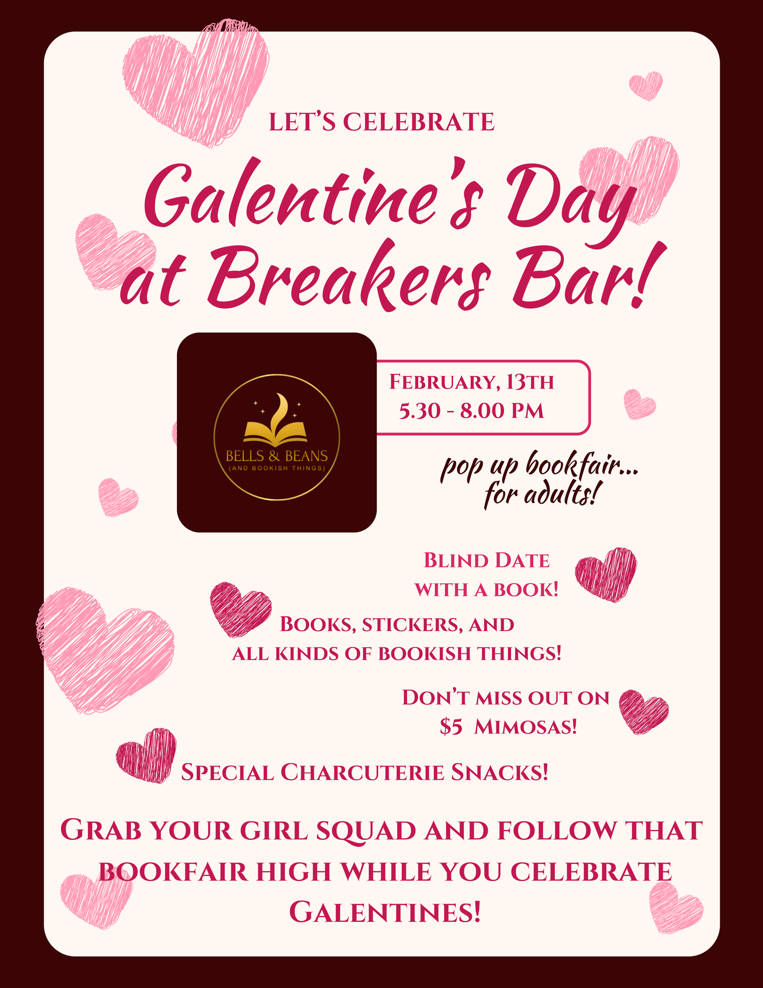 Grab your gals and celebrate Galentine’s Day at Breakers Bar in Warroad, MN with a pop-up bookfair made for friendship, fun, and fabulous reads. Browse a curated selection of books—from romance and self-love to must-read fiction and perfect gift picks—while sipping your favorite drink.